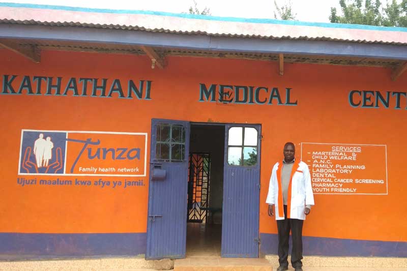 Mr Gitonga Ndii, outside his Kathathani medical centre located at Kathathani Market, Chuka Sub County, Tharaka Nithi County. The clinic is part of the Tunza family health network, a franchise of more than 400 private health providers across the country supported by PS Kenya, a sub-awardee of the USAID funded Tuberculosis Accelerated Response and Care activity (TB ARC II) implemented by Centre for Health Solutions – Kenya to offer TB services.